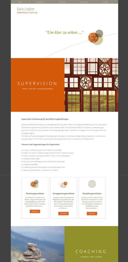 Karin Lindner bietet Supervision und Coaching für Einzelpersonen, Teams und Gruppen. Die Website wurde farblich auf der bestehendenden CD aufgebaut. Seriösität, Professionalität und die Botschaft der Supervisorin Karin Lindner stand im Fokus des Designprozesses. Der moderne Onepager glänzt durch klare Strukturierung, sehr geringe Ladezeit und perfekte Usability.